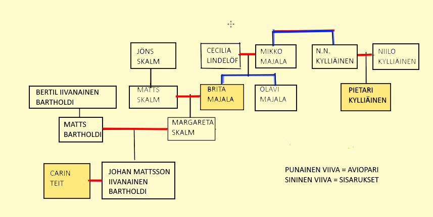 Alla olevassa kaaviossa on esitetty Pietari Kylliäisen sukulaisuus perijätär Britaan ja Carin Teittiin