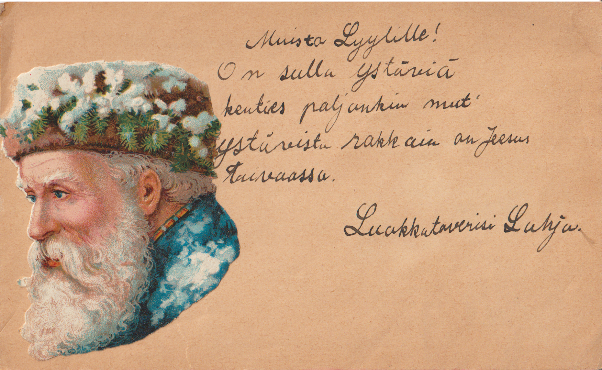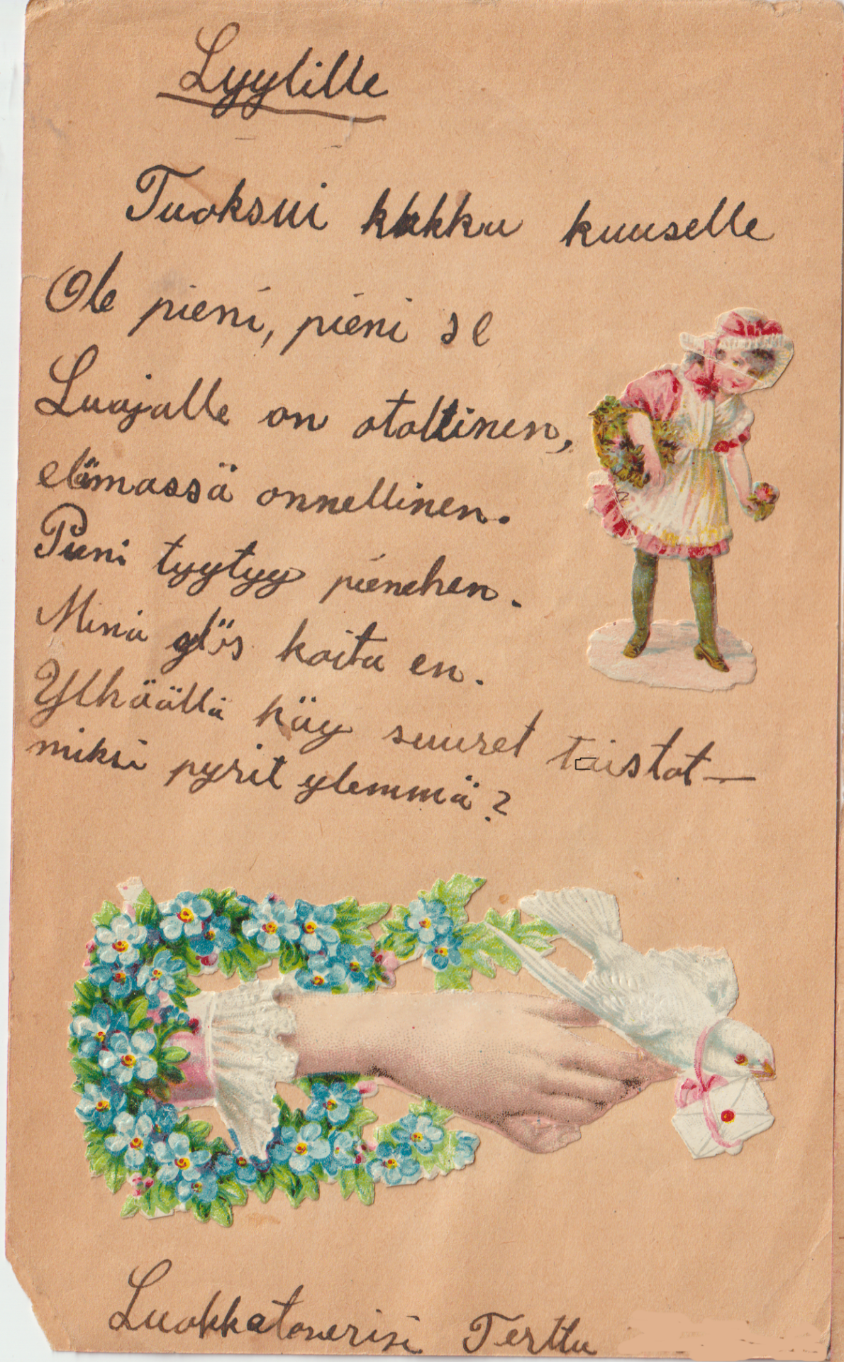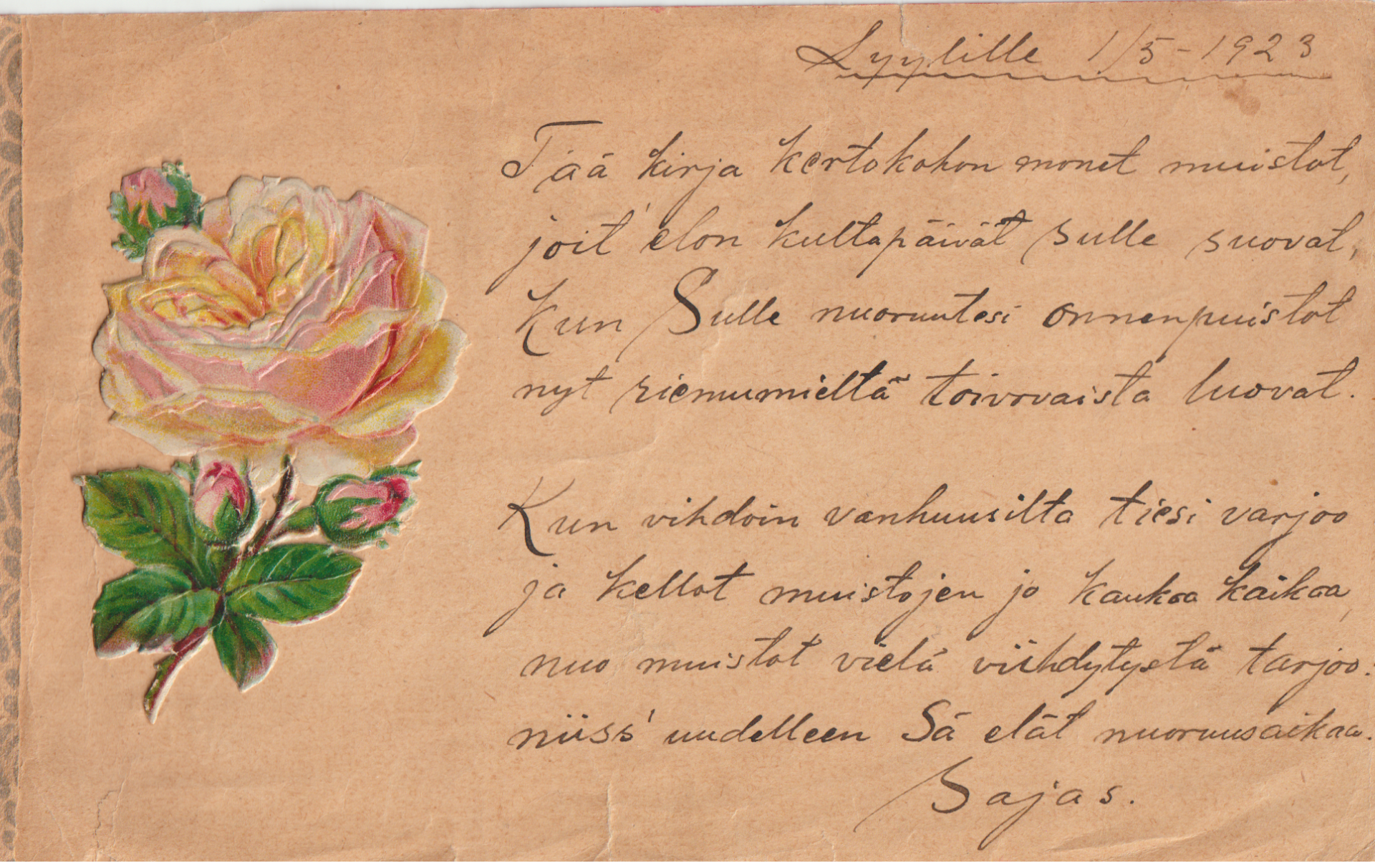 Äidin kuolemasta on jo yli kolmekymmentä vuotta, mutta vasta tänä vuonna sain nähdä hänen lapsuutensa muistovärsyalbumin. Se oli isän selvittämättömien papereiden joukossa, jotka olivat siirtyneet tyttärelleni veljeni kuoleman jälkeen. Muistokirjassa oli Mikkelin yhteiskoulun ensimmäisen luokan tyttöjen kirjoittamia muistoja vuodelta 1922-1923. Olipa siellä opettajienkin kirjoittamia muistovärsyjä, mutta tähän olen laittanut vain yhden, jonka oletan olevan runoilevan rehtori Jooseppi Sajaniemen omaa tuotantoa.