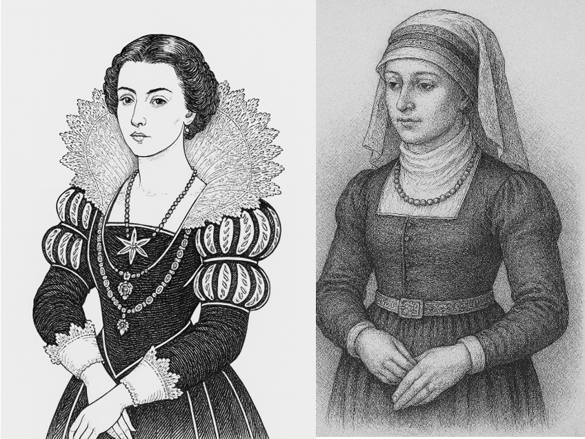 Kirjallisuudessa esiintyy kuva Katarinasta hattu päässä ja pyysin tekoälyä ottamaan alkukuvaa varten sen pois. Oikealla on esiäitini Katarina Teit ja hänen kohdallaan pyysin kuvaa 1500-luvulla eläneestä aatelisesta papinrouvasta.