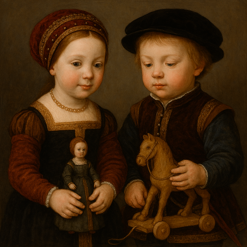 Tulipa käytyä ukrainalaisten ystävien kanssa turistimatkalla Turussa ja pitkästä aikaa myös Turun linnassa. Kolmannentoista isoisoisäni veli Lars Hordeel asui aikoinaan linnassa vaimonsa Katarina Hannuntyttären (kuva vasemmalla) ja heidän kolmen tyttärensä kanssa 1500-luvun loppupuolella. Tuntui epätodelliselta istua penkillä kauniissa tornihuoneessa, joka oli ollut perheen lastenhuone. Siellä tytöt ja aikaisemmin myös Katarinan vanhemmat lapset olivat leikkineet ja viettäneet aikaansa. Luultavasti heillä oli linnan puusepän tekemiä leluja. Saattoi heillä olla myös hienompia leluja, koska Saksassa oli alettu tehdä teollisesti leluja. Kuva alla, tekoäly.