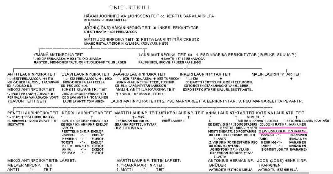 Noudatan taulun tietoja kuvaillessani Katarinan lapsuusperhettä. Ensin kerron Larsin veljestä Martinus Matthie Teitistä, joka oli perheenisä Larsin veli ja Katarinan setä, mutta puuttuu sukutaulusta, - ehkä siksi, että oli lapseton. Martinus Mathie oli Martti Lutherin oppilas ja Mikael Agricolan opiskelutoveri Wittenbergin yliopistossa vuodesta 1536 alkaen. He suomensivat opiskeluaikoinaan Uutta testamenttia ja myöhemmin Martinus oli jäsenenä Agricolan johtamassa Raamatunkäännöskomiteassa. Mielenkiintoista on se, että Kustaa Vaasan neuvontantaja Georg Norman kutsui Martinus Teitin tulevien kuninkaiden Eerik XIV:n ja Juhana III:n opettajaksi vuonna 1542.