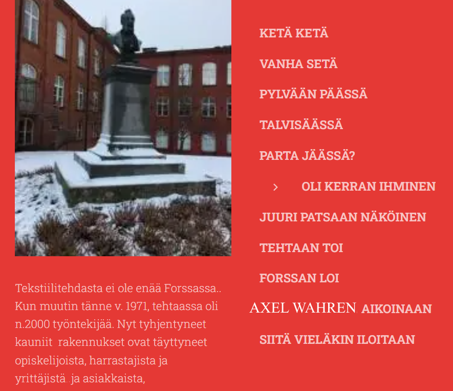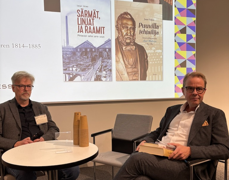 Kirjamessuilla mainittiin Forssa ainakin kahdella eri lavalla. Jouni Yrjänällä (kuvassa vasemmalla) oli mahdollisuus viidentoista minuutin kestäneen haastattelun ajan kertoa kirjoittamastaan Wahrenin elämäkerrasta (Puuvillatehtailija – Suurteollisuusmies Axel Wahren 1814 - 1885, Siltala). Häpeäkseni tunnustan, että en ole sitä vielä lukenut. Korjaan puutteen pikimmiten. Lounais-Hämeen Louna-kirjaston yhdestätoista niteestä vain yksi on lainassa. Olisikohan kirjan paksuus vaikuttanut liikkuvuuteen. Olenpa minäkin kirjoittanut Wahreinsta lapsille tarkoitetun lorupussin lorun verran: