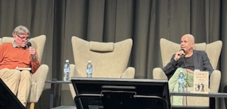 Olin lukenut keväällä Auschwitziin joutuneesta budapestiläisestä koulupojasta ja hänen paluustaan kotiin sodan päätyttyä. Se oli ensimmäinen kirja, joka sai minut tajuamaan, että ihmisten elämä keskitysleirien ulkopuolella oli mennyt eteenpäin tavalla, joka toi vaikeuksia kotiinpalaajien elämään. Messuilla oli vieraana unkarilainen Gabor T. Szanto (kuvassa oikealla), joka oli kirjoittanut kirjan: 1945 ja muita kertomuksia, Basam Books, 2025. Se kertoi kotiinpalaajien elämästä eri vuosikymmeninä. Haastattelijana toimi kirjan kääntänyt Anssi Halmesvirta.