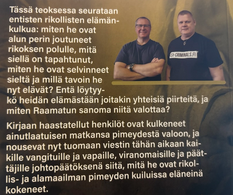 Kristillisen kirjan yleisöäänestyksen voitti ylivoimaisesti poliisipäällystöön kuuluvan Aaro Hankilanojan kirjoittama (kuvassa vasemmalla ja Late Johansson oikealla) ja Aikamedian kustantama: "EX-CRIMINALS Oikeuden edessä". Kirja kertoo kahdeksan uskoon tulleen rikollisen elämästä. Viimeinen heistä oli entinen poliisi ja entinen innokas seurakuntanuori, joka oli luopunut uskosta. Hänen rikollisen tarinansa alun olin kuullut jo aikaisemmin, koska tunsin hänen nuoruuden seurakuntansa työntekijän - joka myös oli luopunut uskosta ja kirkon virasta. Ystävättäreni ei ruvennut rikolliseksi. Myös hänet Jumala veti takaisin yhteyteensä ja hän palasi papiksi takaisin siihen samaan seurakuntaan, josta oli aikoinaan lähtenyt uskonsa menettäneeeenä. Heidän kummankin paluunsa on suuri Jumalan ihme.