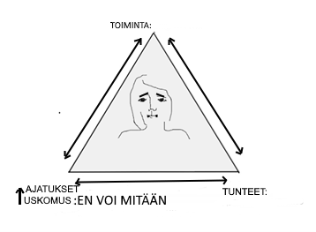 Nyt pitäisi päästä hyvän kehälle ja löytää vaikka väkisin positiivisia, itseä kannustavia ajatuksia ja valoisampaa tulevaisuutta vakuuttavia ajatuksia, vaikkei niihin aluksi uskoisikaan. Positiivisten ajatusten toistaminen rentoutuneessa tilassa, muuttaa lopulta uskomusta itsestä. Valoisat ajatukset alkavat tuntua uskottavilta ja sitä kautta muuttuvat tunteetkin ja toimintakin muuttuu aktiivisemmaksi ja sosiaalisemmaksi.