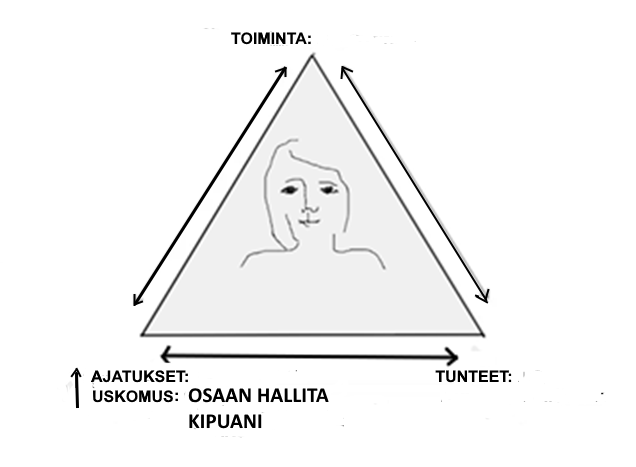 7. Seitsemännessä vaiheessa päästään viimein kognitiivisen terapian menetelmien käyttämiseen kipuun liittyvien ajatusten ja tunteiden hallitsemiseksi. Olen piirtänyt aikaisemmin havainnekuvan pahan kehällä olevasta naisesta, jonka kivun tuntemista lisää uskomus, ettei voi tehdä itse mitään. Jos huomaat, että sinulla on tällainen uskomus, voit miettiä minkälaisia negatiivisia ajatuksia sinulle on herännyt ja mitä hankalia tunteita olet tuntenut.
