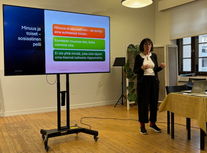 Me Kanta-Hämeen psykologit opiskelimme viime perjantaina muistin hataruudesta ja muistojen muuttumisesta psykologi Marja Saarenheimon toimiessa kouluttajana (Kuva). Hän vertaa muistin toimintaa metsässä sijaitsevaan alati muuttuvaan polkujen verkostoon. Ne polut vahvistuvat, joita pitkin kuljetaan, tosin niissäkin voi tapahtua muutoksia, jostain syystä aivot lisäävätkin sivupolun jonkun uuden tiedon takia. Minunkin aivoissani pohdinta siitä, että käytännöllinen äiti ei ollut voinut pukea minua röyhelöessuun matkalle, vaan se essu oli tullut sinne valokuvasta sai muiston muuttumaan. Vaatetukseni jää kuitenkin unohduksen peittoon niin kuin suurin osa episodisen muistin alueeseen kuuluvista muistoista.