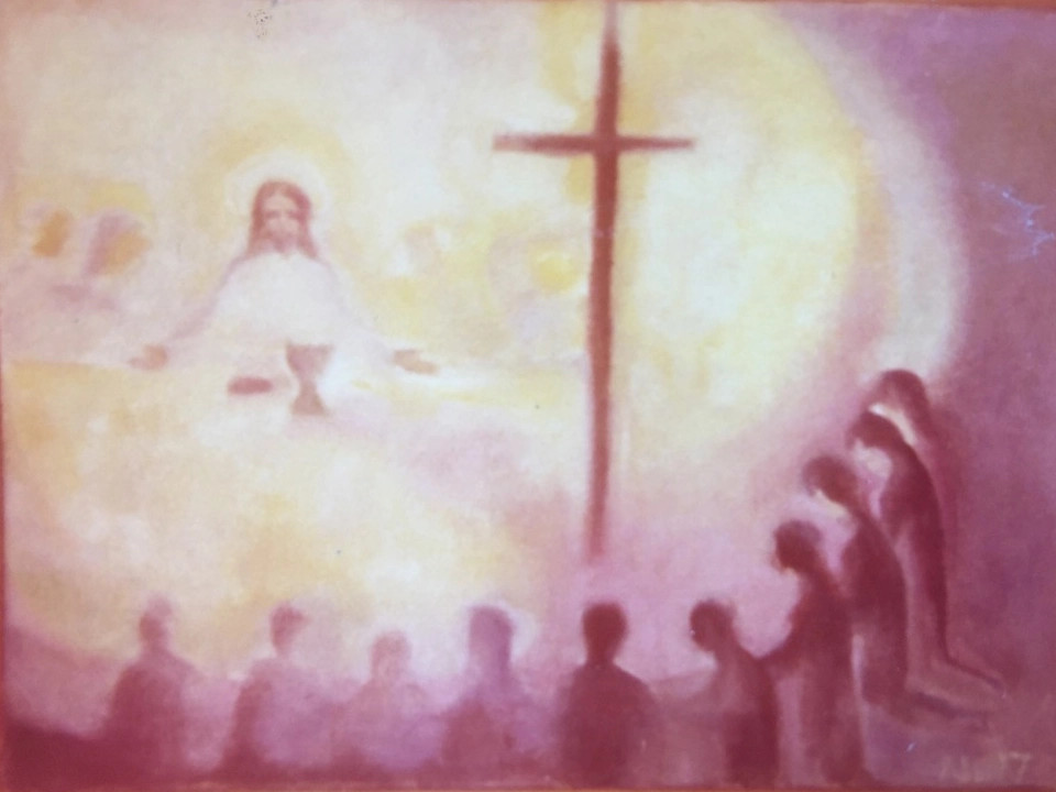 En muista maalasinko yllä olevassa kuvassa olevan taulun sen kokemuksen jälkeen tai sen innoittamana, mutta sitä maalatessani minulla ei ollut mitään käsitystä teologisesta näkemyksestä, jonka mukaan ehtoollispöytä on puolikaaren muotoinen tietystä syystä. Vasta myöhemmin kuulin siitä. Halusin vielä tarkistaa tekoälyltä sen nettimaailmasta kokoaman teologisen mielipiteen ja se vastasi: