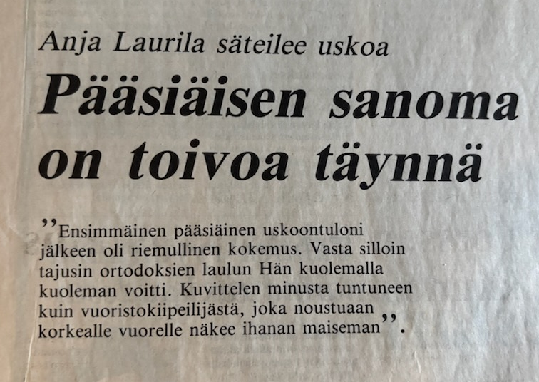 Tuttu toimittaja kysyi, voisiko hän tehdä minusta pääsiäisajan lehteen haastattelun. Olin julkaissut kaksi kristillistä nuortenkirjaa vähän aikaisemmin. Sellaisestahan kirjailija ei tietenkään voi kieltäytyä. Toimittaja oli etukäteen kysynyt päätoimittajalta, saako artikkelissa tulla kristillinen sanoma esiin. Päätoimittaja oli jopa kannustanut siihen. Siihen aikaan toimittajilla ei ollut tapana tarkistuttaa tekstejään. Täytyy sanoa, että kun hain lehden postilaatikosta pitkäperjantaina, olin hämmästynyt ja hämmentynyt. Juttu täytti koko ison sivun. Ensimmäisenä iski silmiini johdanto: