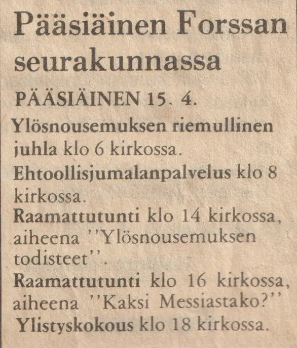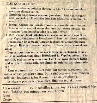 Osallistuin jokaiseen tilaisuuteen ja väkeä riitti kaikkiin kokoontumisiin. Seurakunta oli ostanut Forssan lehdestä kokonaisen sivun, jossa seurakuntalaiset kertoivat omasta uskoontulostaan. Sivulla kerrottiin myös (yksi tavoista), miten lukija voi tulla uskoon: