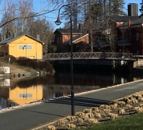 Kun siirryimme Elävien kuvien teatterista (kuva alla) siltaa pitkin joen tälle puolelle kotiini, alakerran rouva oli tehnyt ikkunastaan havaintoja. Hänen mielestään oli erikoinen näky, kun sillan täydeltä tuli iso joukko pitkiä, hoikkia iloisia ihmisiä.