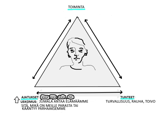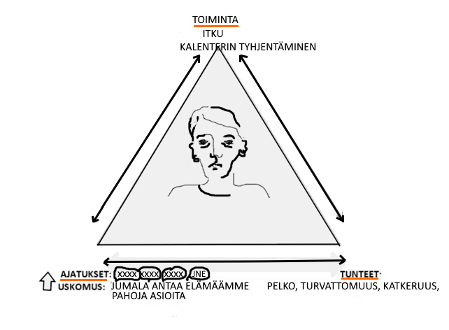 KOGNITIIVINEN TERAPIA PERUSTUU SIIHEN, ETTÄ AJATTELU, TUNTEET JA TOIMINTA (KÄYTTÄYTYMINEN) OVAT JATKUVASSA VUOROVAIKUTUSSUHTEESSA TOISIINSA. VAIKUTTAMALLA YHTEEN NIISTÄ, MUUTKIN KAKSI MUUTTUVAT. SAIN RAAMATUNLAUSEIDEN AVULLA MUUTETTUA VIRHEELLISEN USKOMUKSEN JUMALAN AJOITTAISESTA PAHANTAHTOISUUDESTA.