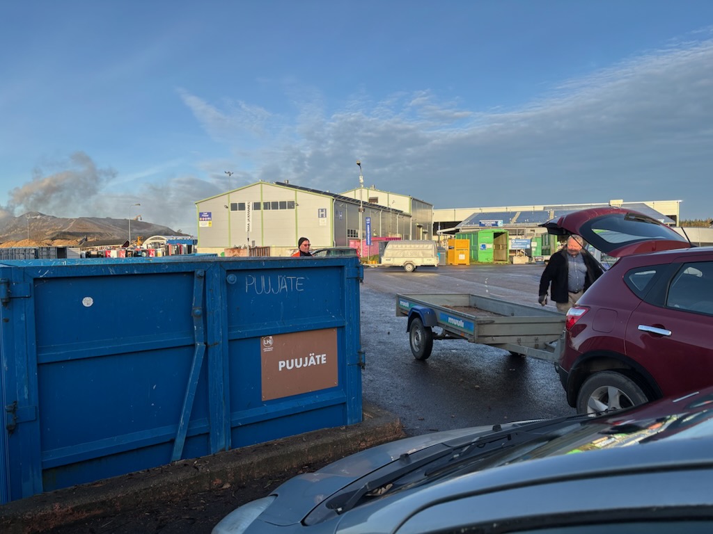 Kognitiivisen terapian antamat työkalut saivat minut selviytymään hankalista tunteista turvallisuuteen, rauhaan ja toivoon ennen nukahtamista. Sitten päätin käyttää tiistaina "työkalupakissani" olevaa fyysistä toimintaa: puuhastelua kotona. Suuntautuminen mielekkääseen tekemiseen on todettu hyväksi selviytymiskeinoksi. Mielialani oli jo kohonnut ja päätin tietoisesti kohottaa sitä vielä lisää kaatopaikkareissulla. Olin jo muutaman kuukauden ajan suunnitellut vieväni erilaista puujätettä Kiimassuolle, mutta en ollut saanut aikaiseksi. Nyt keräilin nurkistani listanpätkiä ja kovalevyjä ison laatikollisen. Aurinko paistoi ja mieliala kohosi yhä ja otin tilanteesta muistoksi valokuvan.