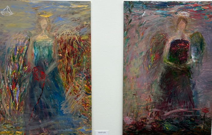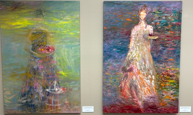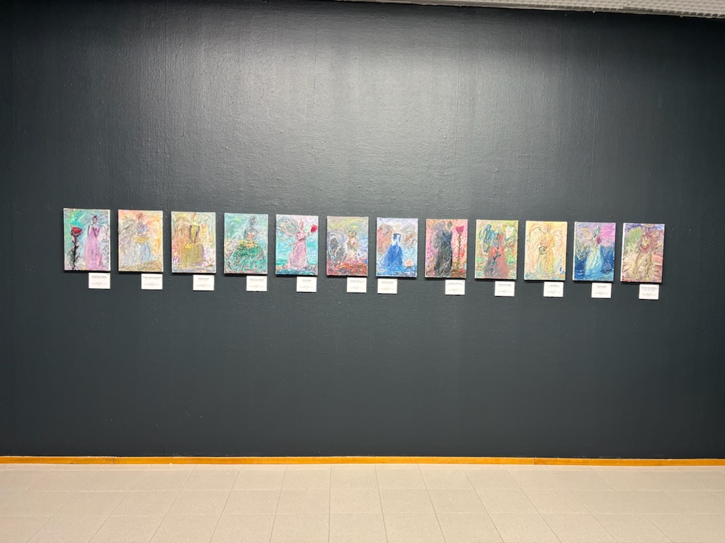 Myös Nanna Susilla oli samoja aiheita, eikä hän varmaankaan tuskastellut aiheiden rajoittuneisuutta. Hän maalasi samantapaisia pitkämekkoisia naisia toinen toisensa perään. Myös vesistöaiheisia tauluja oli paljon ja yleensä niistä löytyi se puukin ja pikkuinen purjevene. Kaikki teokset oli maalattu vuoden 2025 aikana. Alla on kuva pienikokoisista naismaalauksista,