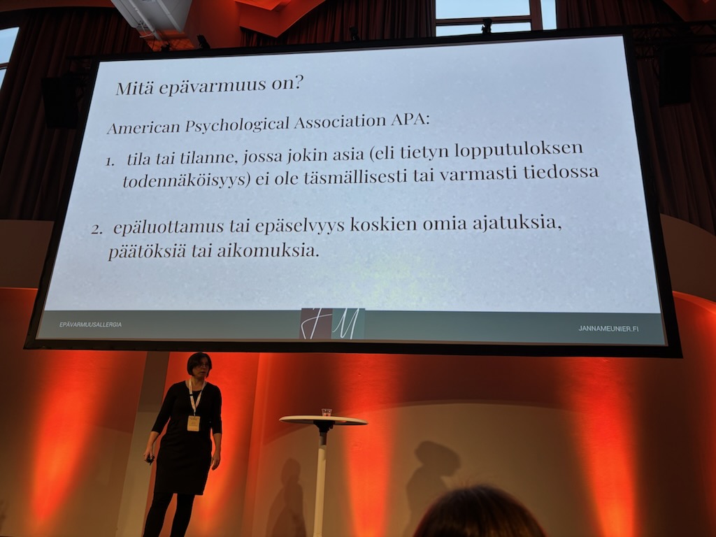 Olen ollut viimevuosisadan puolelta lähtien kiinnostunut kognitiivisesta terapiasta ja nyttemmin varsinkin sen toisen aallon skeematerapiasta (tunnelukkojen käsittelystä) ja psykologipäivillä tutustuin mielenkiinnolla sen kolmannen aallon menetelmään, joka on nimeltään HOT. Aihetta käsitteli Janna Meunier (kuvassa alla). Luennon otsikko oli hieman erikoinen: "Epävarmuusallergia: kuinka tulla toimeen epävarmuuden kanssa."