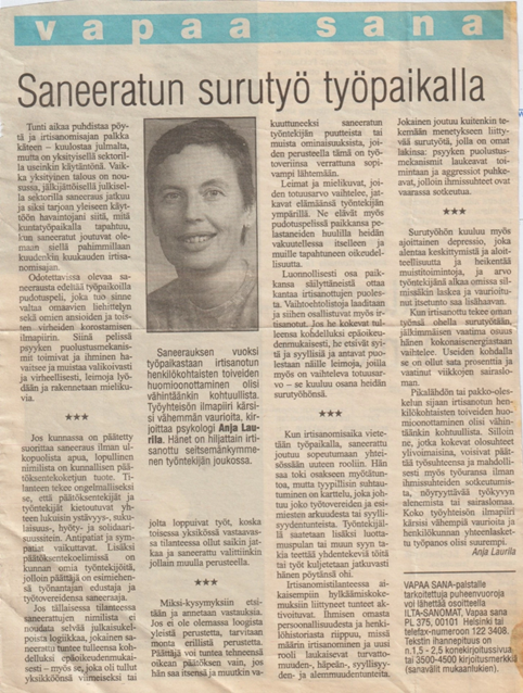 Osallistuin Tampereen yliopistossa lisensiaattiseminaariin ja siellä keskusteltiin, miten julmaa on se että työpaikasta joutuvat irtisanotut lähtemään samana päivänä eivätkä saa olla irtisanomisaikaa töissä. Olin hämmästynyt osallistujien ja professorien tietämättömyydestä ja päätin levittä tietoa, joka vähentää kärsimystä. Niealaisin häpeäntunteeni ja valitsin foorumikseni Iltasanomat.