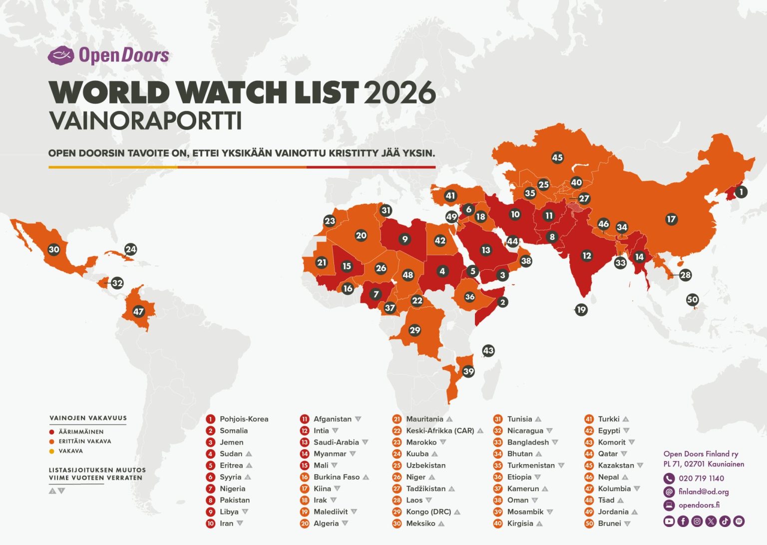 Open doors -järjestö on toinen maailmanlaajuisesti vainottuja kristittyjä tukeva järjestö. Olen sen työn kannattaja ja seuraan sen toimittamasta lehdestä heidän raporttejaan vainoIsta. He ovat julkaisseet tämän vuoden tammikuussa lehdistötiedotteen, joka löytyy kokonaisuudessaan täältä KATSO>>>. https://opendoors.fi/wwl-2026-vainoraportti-lehdistotiedote/